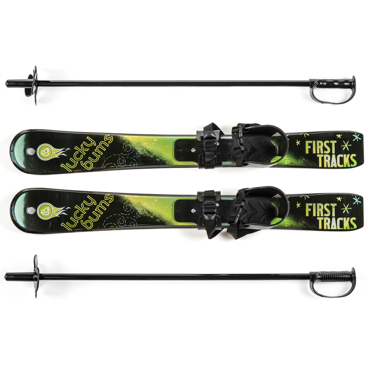 The Lucky Bums Beginner Skis have a junior rocker profile and kickin’ graphic that encourages toddlers to experience the thrill of first tracks. Stomp around the house, the backyard or any gentle slope to practice ski sliding and duck-walking. Get ‘em started young. Starting out in this snow play way makes learning to ski more intuitive so progression comes quicker and easier. Learning to ski is all about confident progress, when everyone is ready to advance to the chairlift, talk to a ski pro about a good rental. Trust me, soon you’ll be working to progress too just to keep up. Get ‘em started confidently. Focus on moving, playing and having fun without fear of losing control. Ski Terrain. Packed snow, flat to gentle slope. These skis do not have metal edges therefore are not suitable for chairlift accessed ski runs. Poles. We skiers know the tots don’t really “need” poles but hey, they’re fun too. Why not play the Penguin Shuffle? The main idea is to slide the ski forward, with help from the poles, without lifting the ski off the snow. That's why it's called the "shuffle". To up the ante, go to a gentle downhill so they can get glide with each shuffle step. Fit. Adjustable binding adapts to fit most Toddler boots size 4-7. Core Users. Suited for Toddlers aged 4 and under. FEATURES – Ski measures 27” long – Scale pattern on the bottom helps to prevent backwards sliding and provides grip in a variety of snow conditions – Durable BPA and Phthalate free construction.
