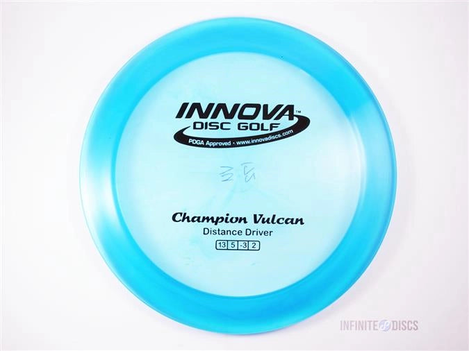 An amazing high speed distance driver, the Vulcan will fly all over the fairway. This understable disc has a huge turn rating (-4), but also has big fade (2). The initial understable nature of this disc makes it suitable for intermediate players, despite its high speed rating (13). The Vulcan is a thin disc (1.4 cm) with a very thick rim (2.4cm). 13/5/-4/2. Innova Champion plastic is a transparent ultra durable hi-tech plastic that provides outstanding performance and long life. Discs in Champion Line plastic maintain their flight characteristics 5X longer than do DX discs.