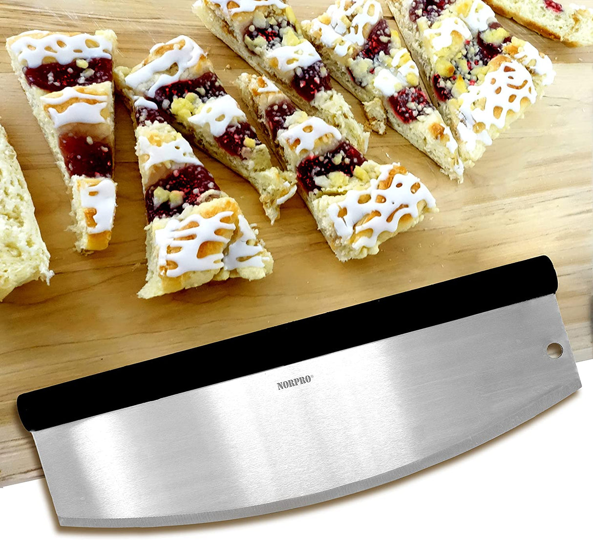 Cut pizza like the pros! Curved blade easily slices with precision in a quick rocking motion! Cut across dishes in one rocking motion. Keeps your toppings / ingredients in place when slicing. Also cuts quiche, pastries, dough, cheesecake, dessert bars, herbs and more!